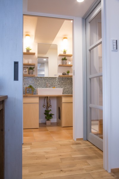 「もともと、マイリノペットのホームページをみていただけで、何となくのイメージしかありませんでした(笑)。一つひとつ自分の希望をヒアリングをして頂きながら、具体的な図面をつくっていきました。特にわがままをいわせてもらったのは、床ですね。以前住んでいた物件が、無垢材をつかったフローリングで足に心地よく快適で、そこは譲れなかったんです。猫のことも考えて、舐めても安全で予算にも合う素材を探してもらいました。さらに、気温が変化しても猫が快適に過ごせるように、洗面所には違った温度感のフロアタイルを使用してもらいました」